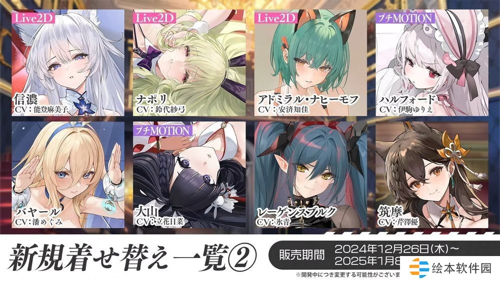 12 月 19 日与 12 月 26 日将分别推出两波全新换装,第一波为新活动中登场的弗里茨·鲁梅、Z52 等新舰船的换装,第二波则是信浓、纳希莫夫海军上将等旧舰船的换装。此外,一部份新换装将推出试衣券。