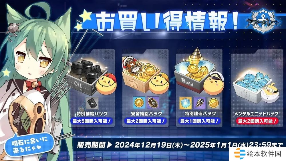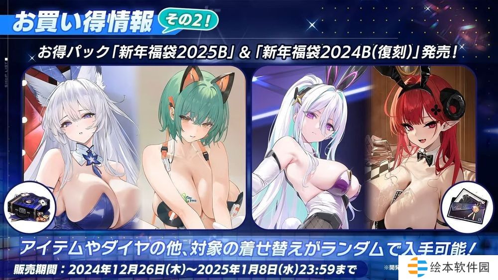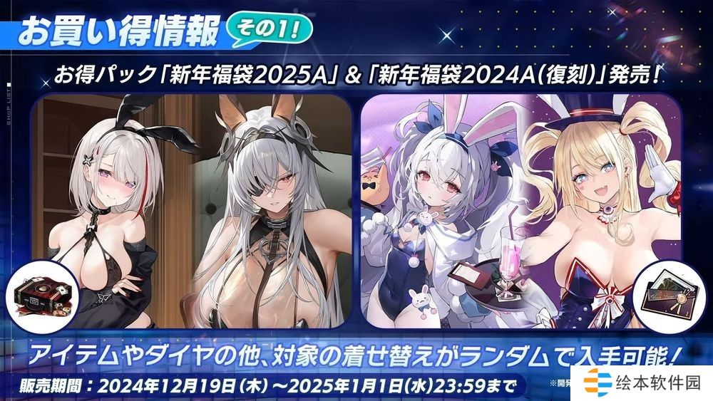游戏内商城将自 12 月 19 日起依序贩卖「新年福袋 2025A/B」、「新年福袋 2025A/B(复刻)」,福袋内容除了游戏道具外,还可随机会得指定换装。一系列可获得游戏内道具的礼包也将于 12 月 19 日开始贩卖。