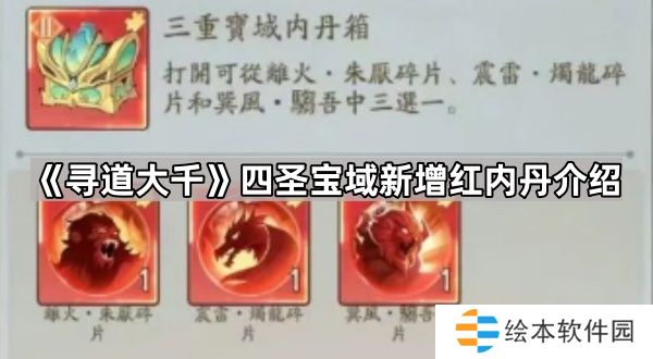 寻道大千四圣宝域新内丹是什么?在游戏寻道大千中四圣宝域一直是一个平民白嫖红内丹的好途径,四圣宝域在时隔许久后也将再次添加一颗红色内丹。许多小伙伴比较好奇新增的这颗红色内丹有什么效果,那么接下来就和小编一起看看《寻道大千》四圣宝域新增红内丹介绍吧。