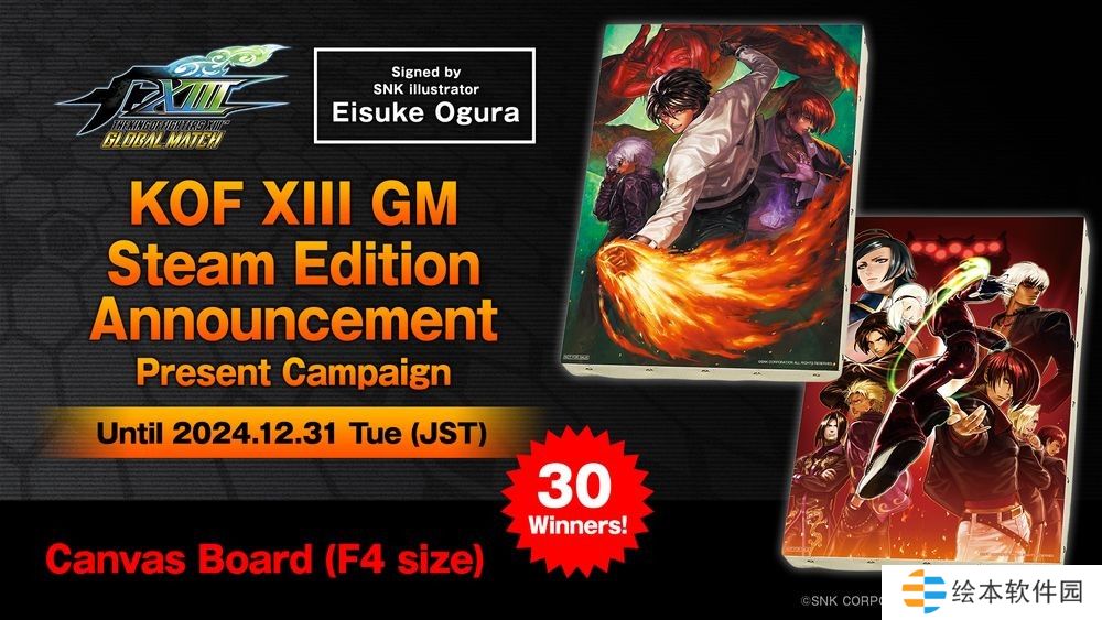 为纪念本次发售,将在KOF 30 周年企划官方 X 帐号(日文、英文)上进行「跟随 & 转发」活动!2 个官方帐号将会抽选总共 30位 幸运用户,赠送附 SNK 画师 OGURA EISUKE 老师亲笔签名的《KOF XIII GM》画板(A4 尺寸)。参加申请截止至为 2024 年 12 月 31 日(周二)23 点 59 分。