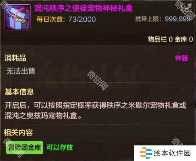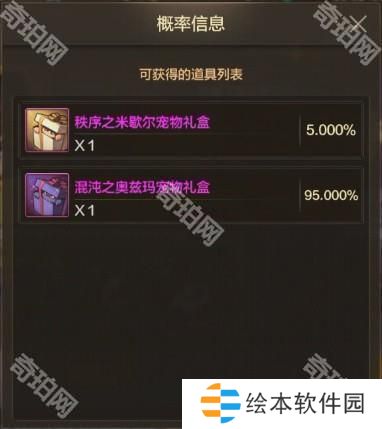 混沌秩序之使徒宠物神秘礼盒开启后,将从“秩序之米歇尔宠物礼盒”和“混沌之奥兹玛宠物礼盒”随机获得一个。