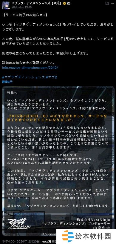 《MUV-LUV DIMENSIONS》宣布将于2025年6月30日停服 在12月24日的直播中公布未来规划《MUV-LUV DIMENSIONS》宣布将于2025年6月30日停服 在12月24日的直