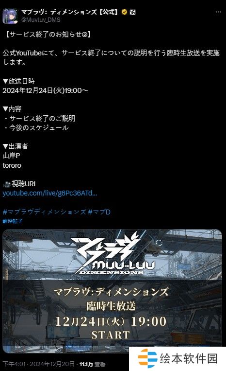 此外,官方预计于 2024 年 12 月 24 日(二)透过 YouTube 举办直播,说明此次终止服务的经过以及今后的规划。