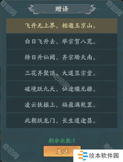 每一个参与飞升大典的道友都可以选择拜贺!拜贺的赠语有8句,可以任选其一,全凭道友喜好选择了!小编选择的是:此朝跃龙门,长生道途昌!选择之后拜贺还能获得50仙玉!