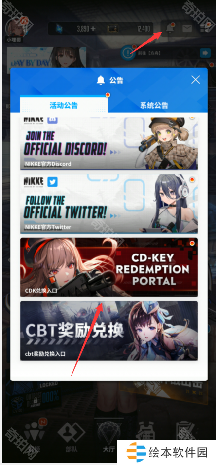 1、进入游戏,点击右上角公告图标,找到CDK兑换入口