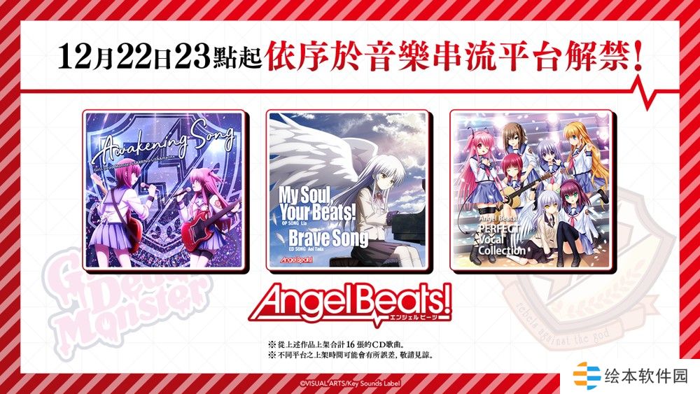 决定于音乐串流平台解禁「Awaking Song」、「My Soul, Your Beats!」等,「Angel Beats!」全 16 张的 CD 歌曲。