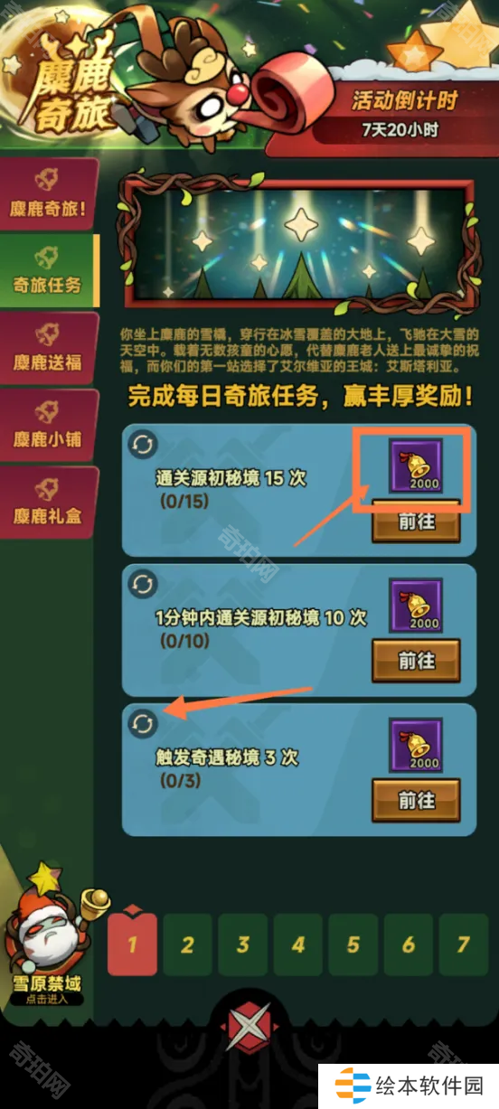 每天会派发6个日常任务,每完成今日的所有任务可以在麋鹿送福一栏领取当日奖励。