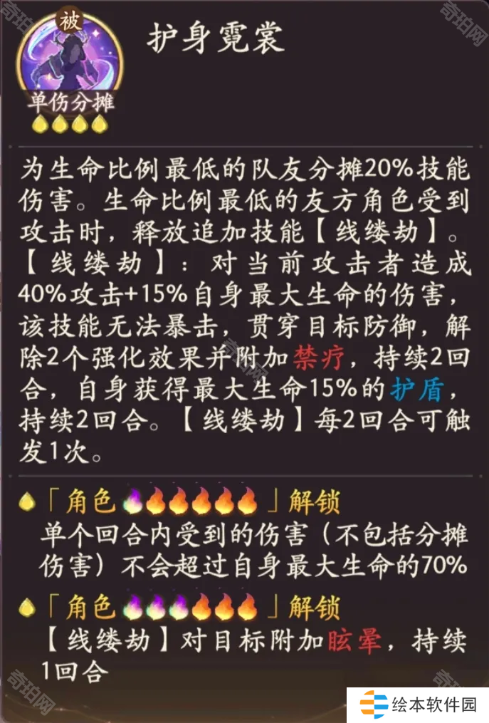 建议优先解锁神话阶段技能命星【护身霓裳】提高分摊比例,其次是第四和五阶段技能命星【千针引】。