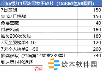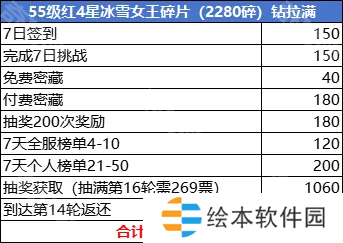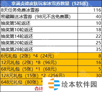 如果要拿到达14轮的“22张冰雪券返还”并且顺便拿下15轮的“贞德皮肤返还”则需要抽满13轮(累计219票)和抽满14轮(累计239票),需要再绿钻购买219-174=45张(因为需要先买票抽满13轮才能拿到14轮的门票返还),如果没有绿钻补足门票则需要购买其他礼包才能拿到这些奖励