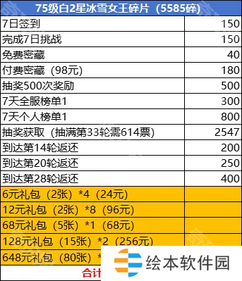 一共消费为:98+24+96+68+256+1944=2486元即可拿到75白2星的冰雪女王,由于本次奖励为自选箱,考虑补贞德的小伙伴也是可以考虑的
