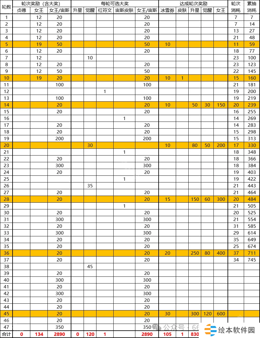 1、1-47轮奖励与消耗汇总(累计消耗代表可以抽满当前轮次)