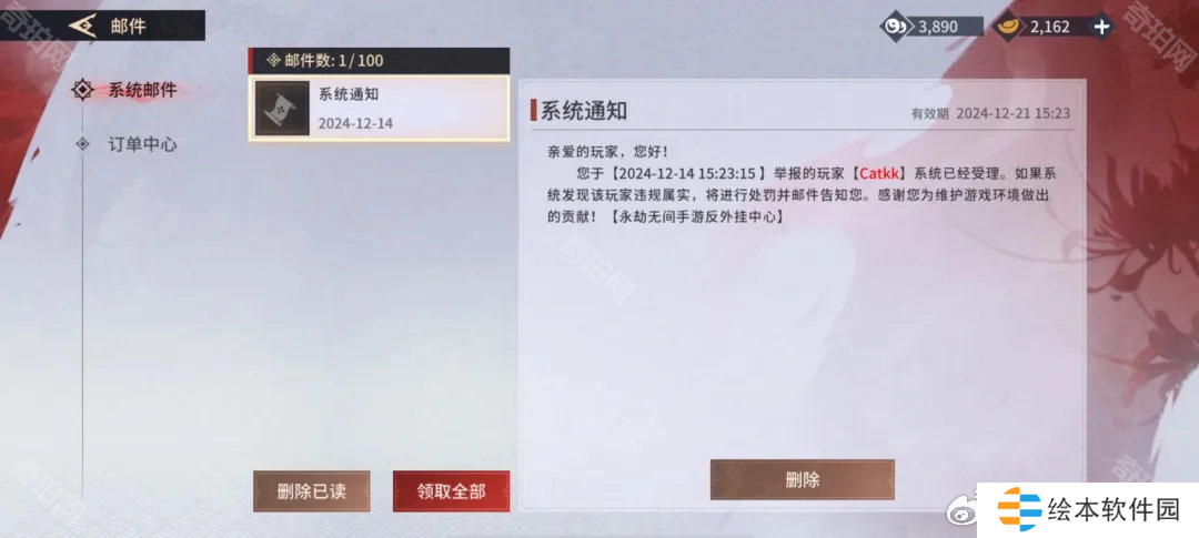 举报成功后,玩家在游戏内【邮件】可以查看恶意组队举报后的反馈