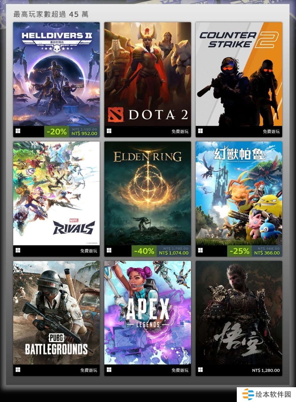 依据最高同时线上人数选出的年度最多人游玩游戏部分,在 Steam 平台最高玩家数超过 45 万的游戏(未依照排行、注:去年为 30 万同上进白金榜,今年提高到 45 万)包括《绝地潜兵 2》、《DOTA 2》、《CSGO 2》、《漫威争锋》、《艾尔登法环》、《幻兽帕鲁》、《绝地求生 PUBG》、《Apex 英雄》、《黑神话:悟空》。