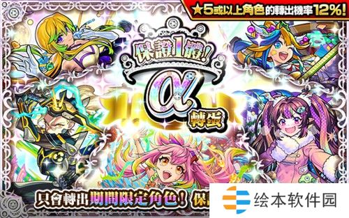 「保证 1 体!α 转蛋」为只会转出期间限定角色的特别转蛋,并保证 1 体是★6 角色,而★5 或以上角色的出现机率也高达 12%。只有 10 连方式,每人仅限抽一次。