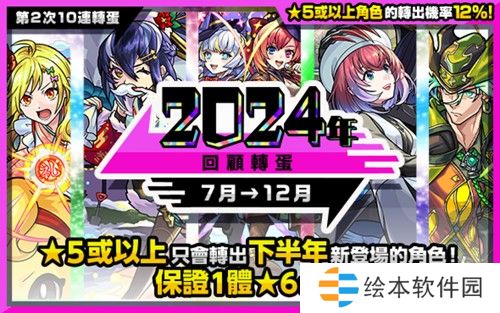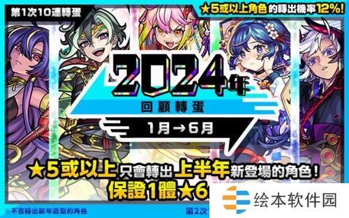 「第 1 次 10 连转蛋」会出现的★5 或以上角色,保证是「2024 年 1 月〜6 月新登场」的角色,至于「第 2 次 10 连转蛋」会出现的★5 或以上角色,则保证是「2024 年 7 月〜12 月新登场」的角色。此外不论第 1 次还是第 2 次,抽选 10 连转蛋都必定会出现 1 体「兽神化后(★6)」的角色。