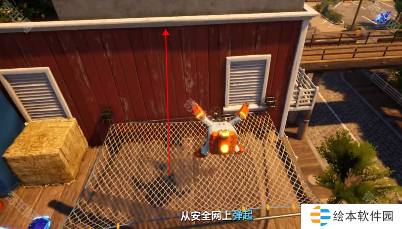 3、左边是拱门,我们来到拱门右边,跳到安全网上