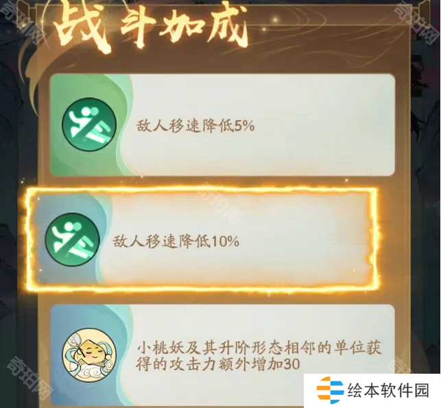 关于加成选择上面,要优先选择减速,不论是什么颜色的减速,优先级都最高,只要把减速叠加到50以上,那么这关就会变得很容易,当没有减速的时候,我们可以选择攻击速度、攻击、或者小桃妖的攻击攻速提升都可,其他的单位的战斗加成选择不太建议选择,当然没有更好的选择时也可选择!