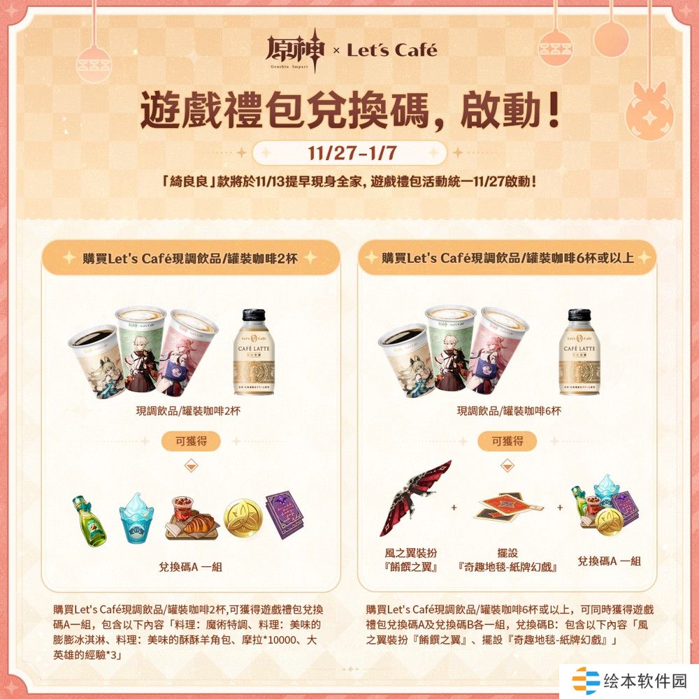 11/27 起至全家便利商店实体店购买「Let"s Café」现调饮品或「Let"s Café」罐装咖啡任 2 杯,即可获得游戏礼包兑换码 A 一组;购买「Let"s Café」现调饮品或「Let"s Café」罐装咖啡任 6 杯或以上,可同时获得游戏礼包兑换码 A 及兑换码 B 各一组 (数量有限、赠完为止)。礼包内容包含限定的风之翼『餚馔之翼』及摆设等,请旅行者把握机会!