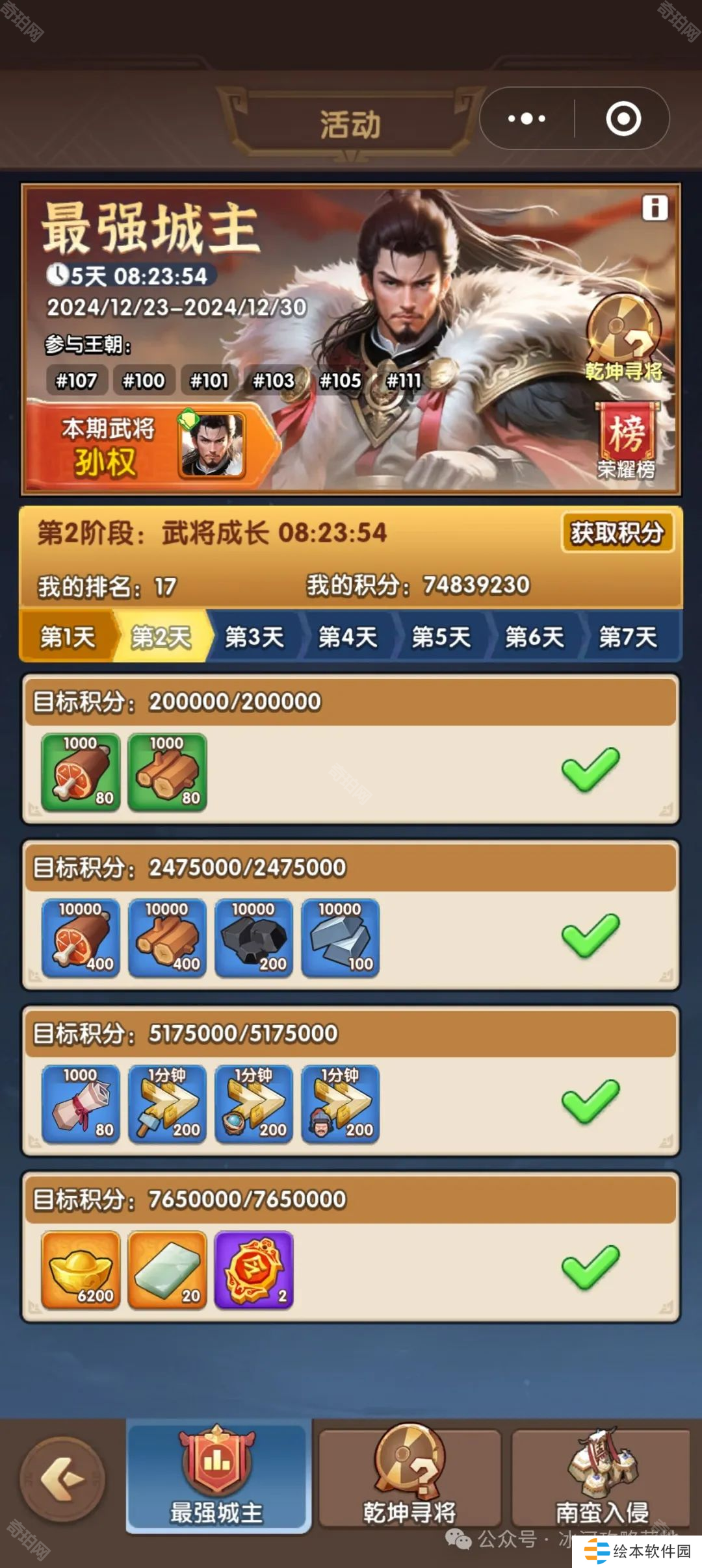 最后一天城主,排名基本没有太大变化,低保建议用汉白玉升火炉或者兵营小格,训兵来做和冲排名,分数也不多,注意看自己排名,差距太多就不要冲了,孙策没有三星的玩家,不要用武将升星拿分,留在第二周的同盟第二天升拿低保。