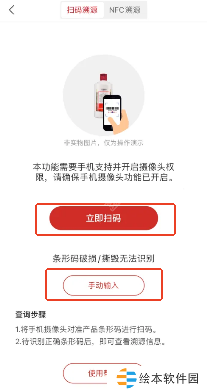 开启收集摄像头权限后点击立即扫码,对准酒瓶上的条形码,等待app自动识别出来
