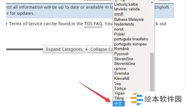 3、随后我们在右上角的语言栏中,根据下拉菜单滑倒最底下挑选中文,如图所示。
