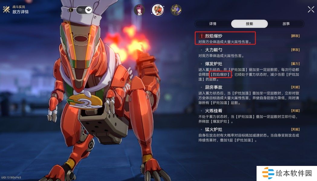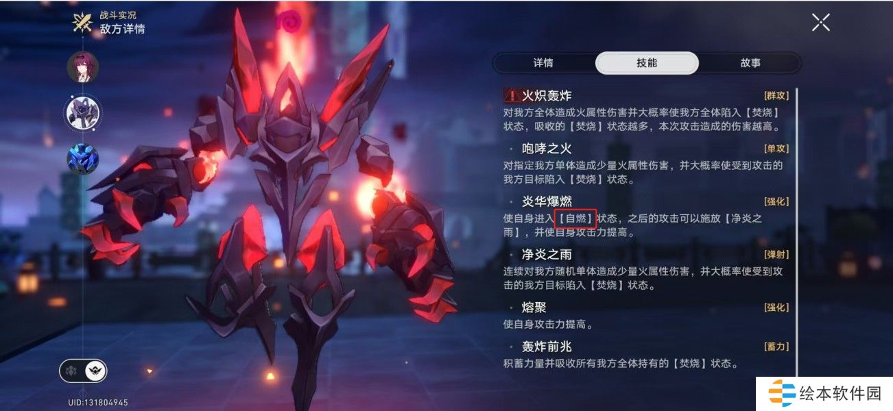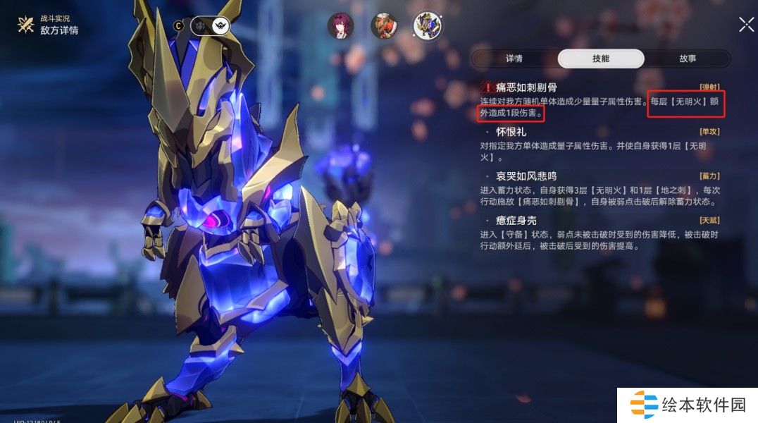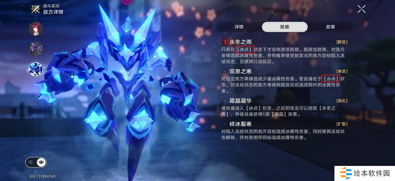 召唤2个精英敌人协助战斗(第一阶段是【外宇宙之冰】和【外宇宙之炎】)。我方单位对召唤物造成伤害时,【首领】也会损失相等的生命值。召唤物被弱点击破时,行动额外延后。任一召唤物被消灭后,其弱点属性会被添加给另一个在场的召唤物,并使其获得【血眼】效果。