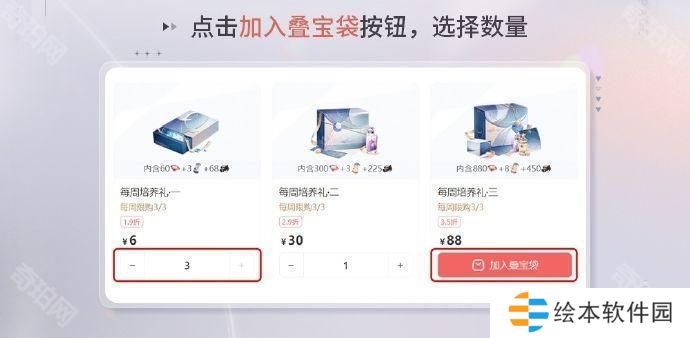 1、设置好要购买的商品数量,然后点击商品下方的加入叠宝袋
