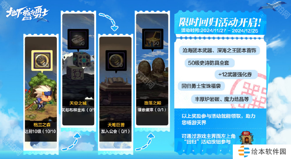 在活动期间,回归的勇士累计登录游戏、与邀请人一起攻坚降临:罗特斯,可领取幸运符、闪亮的一次性强化器、西部深渊派对邀请函、金币等奖励