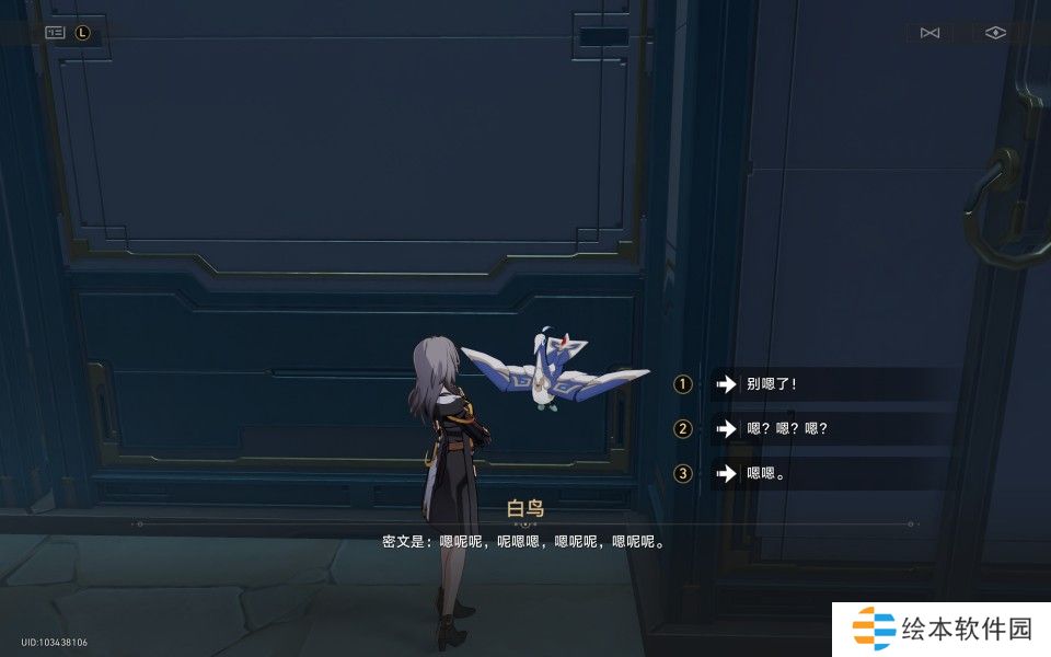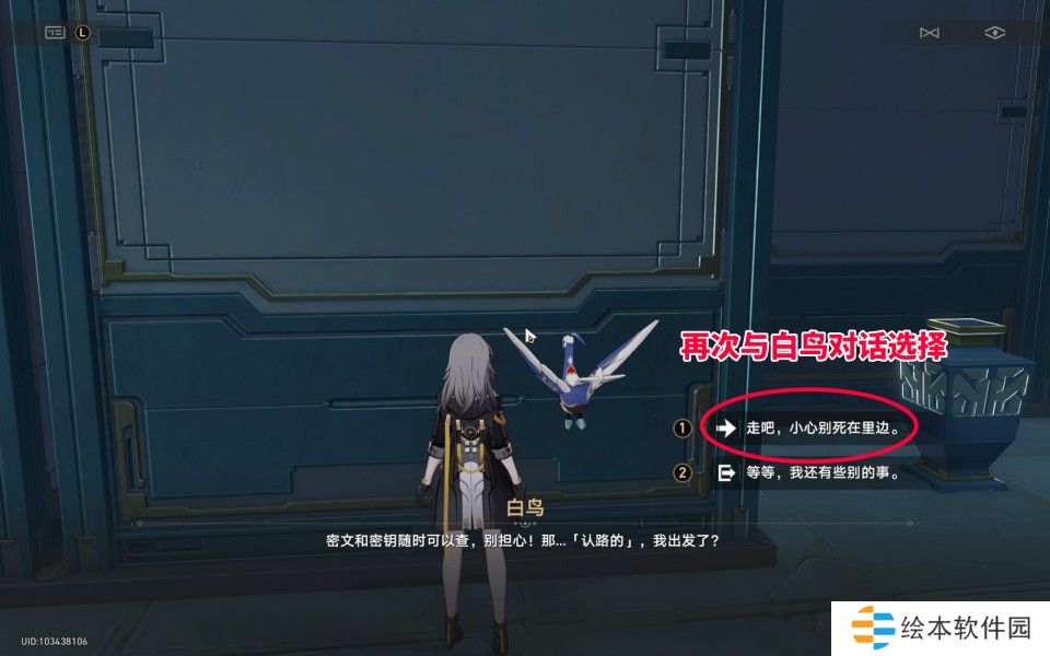 对话随意选,结束对话后再次与白鸟对话,选择「走吧,小心别死在里面」