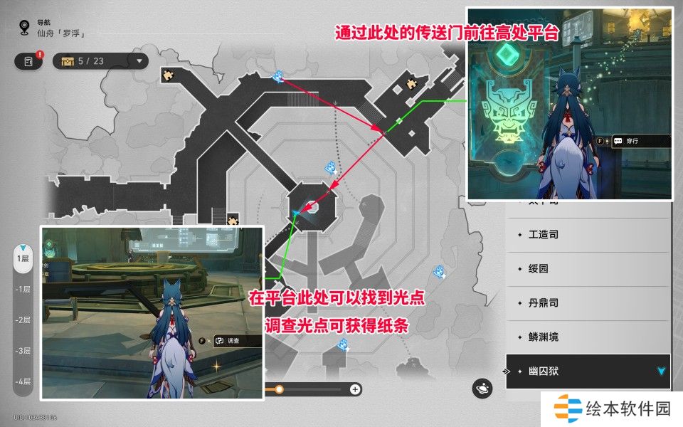 按照如图所示,首先使用传送门穿行至高处平台,在高处平台可找到光点,调查后可获得纸条