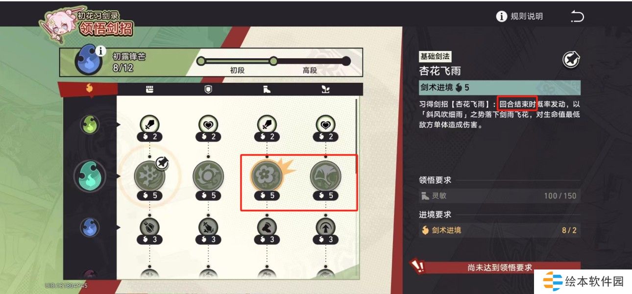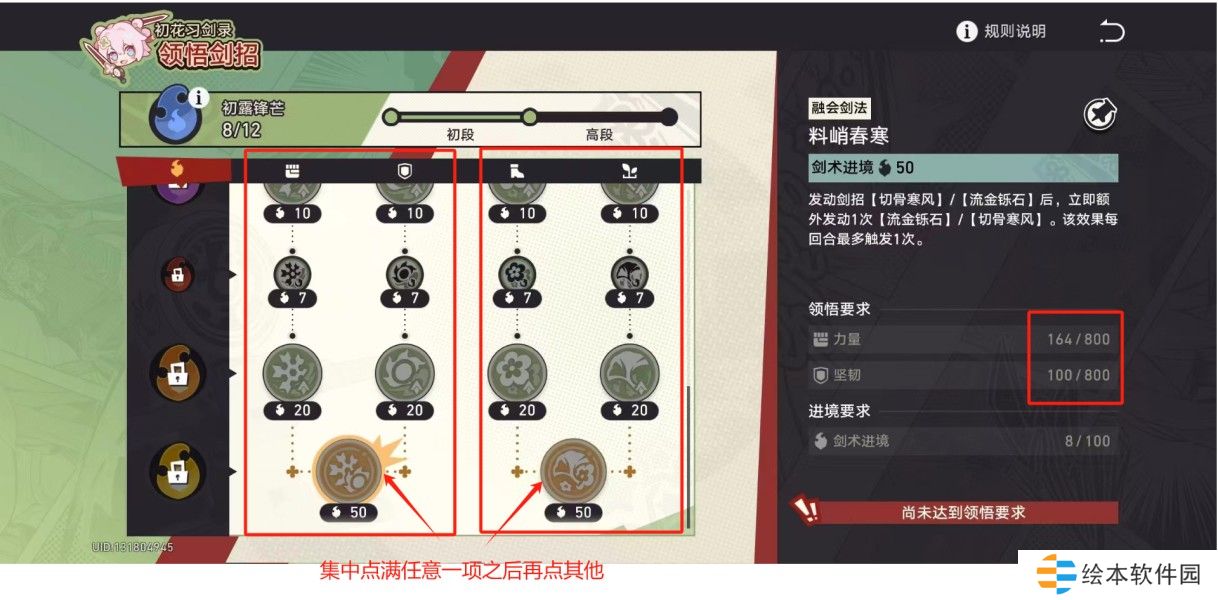 到万应灵丹关卡有【融汇剑法】需要优先将前两项或后两项优先点满,需要两项数值达到800点;