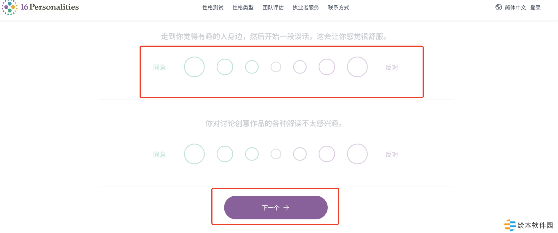 2、在问题页面中我们需要选择自己真实感受的回答,回答完当前页面问题以后点击下一个