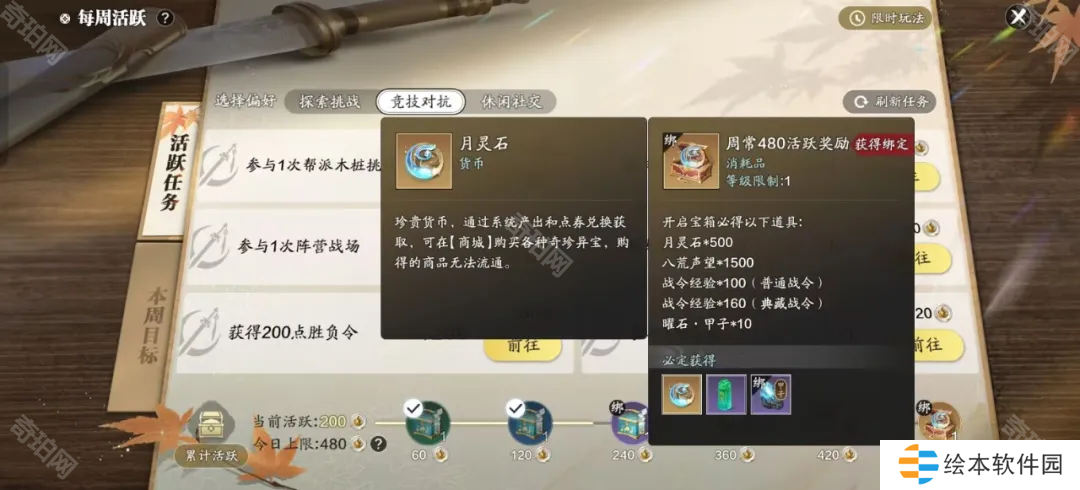 周常活跃达到480可以领取「周常480活跃奖励」,里面包含月灵石*500。