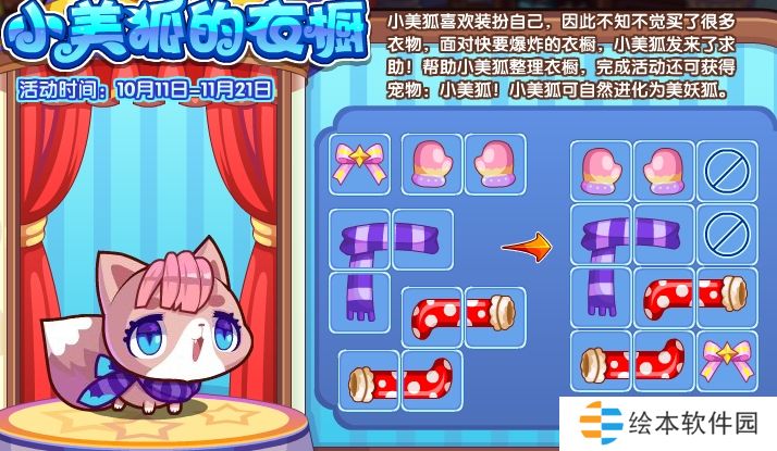 小美狐喜欢装扮自己,因此不知不觉买了很多衣物,面对快要爆炸的衣橱,小美狐发来了求助!帮助小美狐整理衣橱,完成活动还可获得宠物:小美狐!小美狐可自然进化为美妖狐。