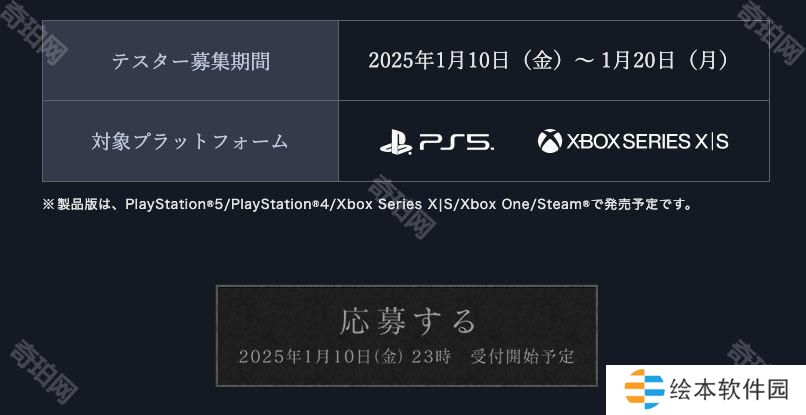 由 FromSoftware 开发、万代南梦宫娱乐发行的协力生存动作游戏《艾尔登法环 黑夜君临》(PS5 / PS4 / Xbox Series X|S / Xbox One / Steam)预计将于 2025 年 2 月举行 PS5 / Xbox Series X|S 版的首次测试,2025年1月10日起开放报名。