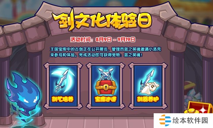 王国宝库中的古剑正在公开展览,管理员蓝之英魂邀请小洛克来参观和体验。完成活动即可获得宠物:蓝之英魂!