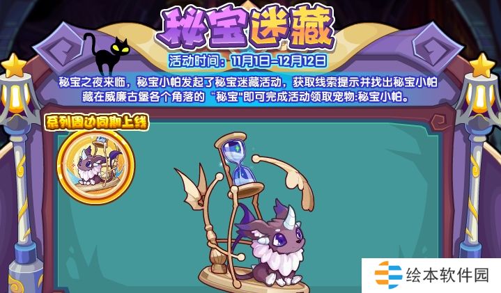 秘宝之夜来临,秘宝小帕发起了秘宝迷藏活动,获取线索提示并找出秘宝小帕藏在威廉古堡各个角落的“秘宝”即可完成活动领取宠物:秘宝小帕。(系列周边也将同步上线草场地商城!)