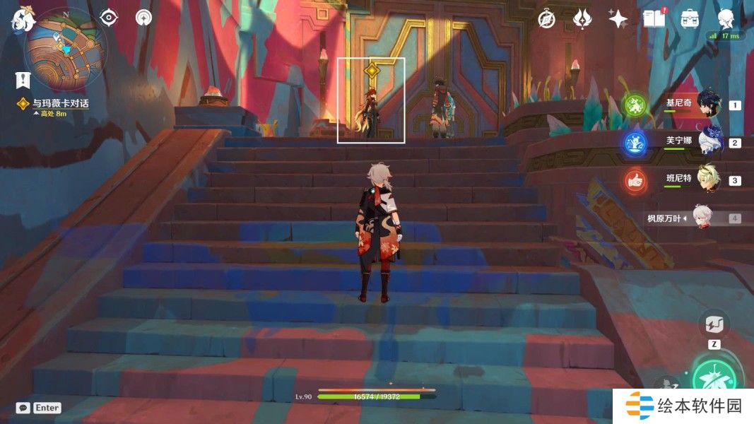 往地图的西北方向走,前往台阶上,与玛薇卡对话2分钟