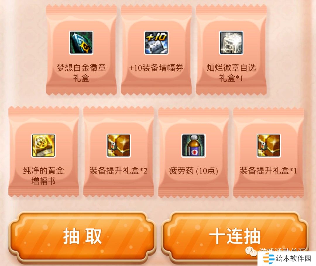 有机会抽到梦想白金徽章礼盒、+10装备增幅券、灿烂徽章自选礼盒、装备提升礼盒、红字书等道具。