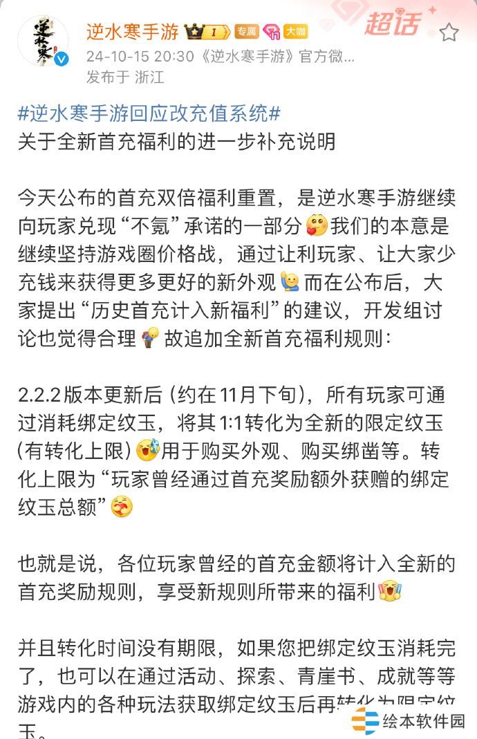 今天公布的首充双倍福利重置,是逆水寒手游继续向玩家兑现“不氪”承诺的一部分