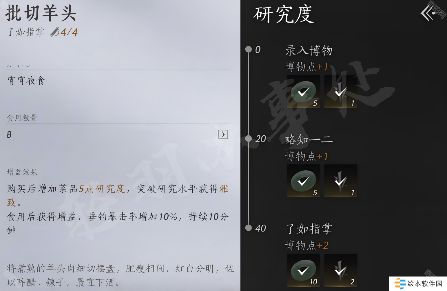 菜品每吃1次可增加5点研究度,研究度每突破一层水平可获得雅致属性,每种食物吃8次即可到达了如指掌水平,一个食物总计可获得4点雅致属性