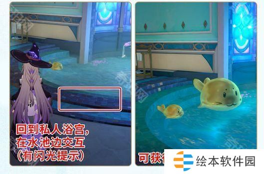 4、我们回到私人浴宫,靠近浴池和闪光点交互,这样我们就成功将大海豹装饰在我们的浴池中了