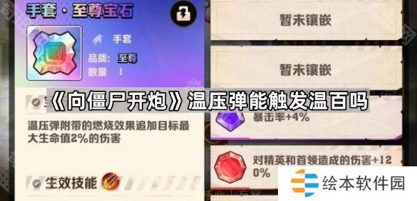 向僵尸开炮温压弹能触发温百吗?在游戏向僵尸开炮中温压弹有多种分支技能,其中许多小伙伴比较好奇宝石的燃烧区域效果和爆炸火花技能能否触发温压弹的百分比伤害。小编在这里进行了相关测试,有需要的小伙伴接下来就一起具体了解下吧。