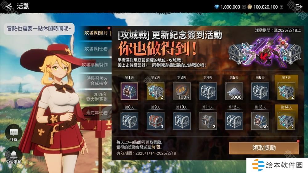 为庆祝「攻城战」上线,《战界:泽诺尼亚》同步推出「你也做得到! [攻城战]更新纪念签到活动」,自即日起至 2 月 18 日,玩家只要每日登入游戏,即可免费获得多样超值奖励,包括史诗级武器支援选择箱、成长支援箱、华丽的召唤券 (10 + 1 次) 选择箱等。