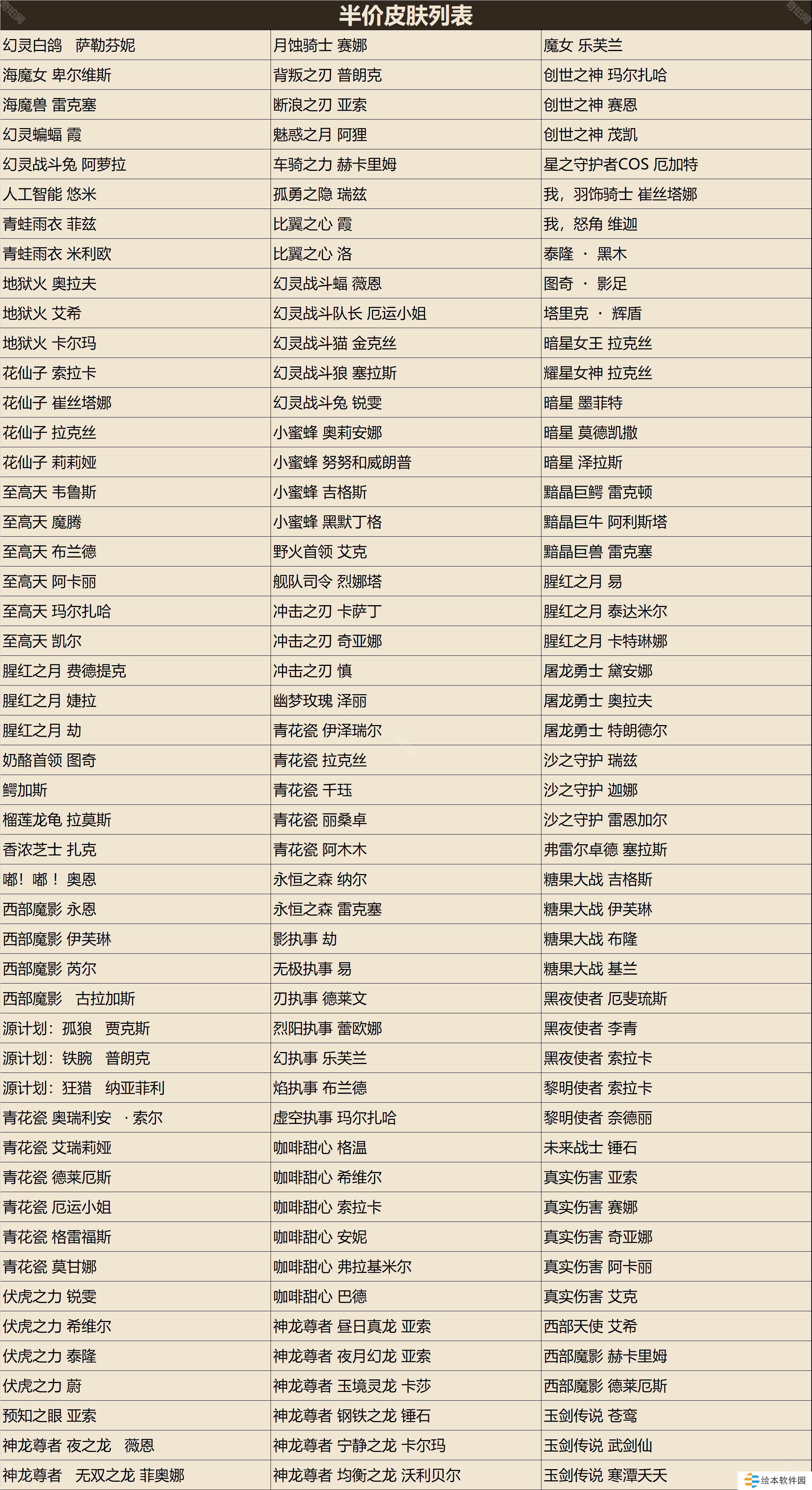 注:所有下表中所列的炫装皮肤在半价期间暂停炫装优惠价格,以五折价格销售,半价结束后恢复炫装优惠价格。