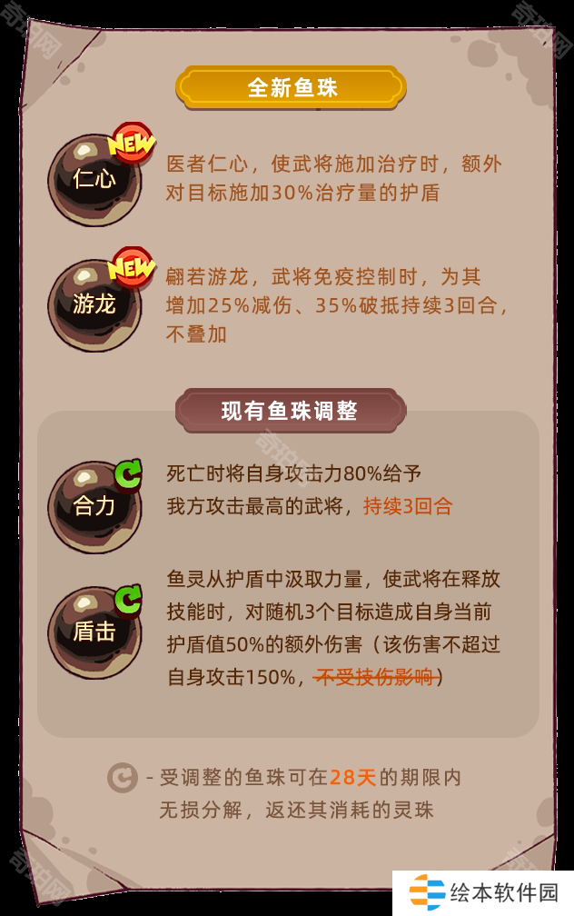 合力鱼珠从持续2回合改成3回合。盾击鱼珠从不吃技能伤害属性改成吃技能伤害属性。