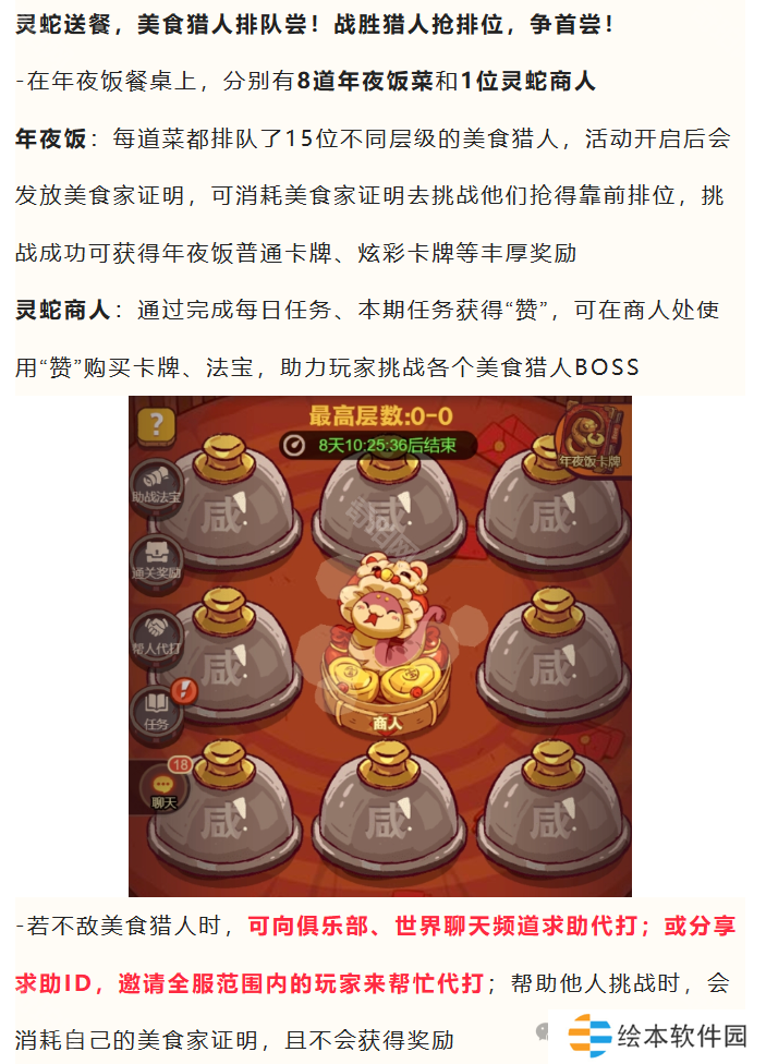 玩法攻略:年夜饭的老活动,不过有一点不同的是,这次可以找大佬代打,代打的人需要消耗自己的美食家证明(相当于入场券),且代打人没有奖励。