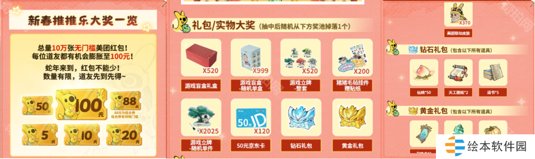 资源奖励:联动皮肤(团团猪)、钻石礼包(50桃子、2天工图纸、5道书)、黄金礼包(1召唤令、5御灵石、50玄黄果)