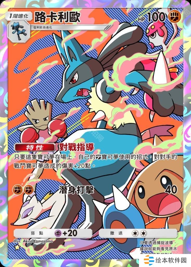 路卡利欧像是在前头引领着其他宝可梦一般,富有动感且流行又缤纷的插画是这张卡牌的独特之处。