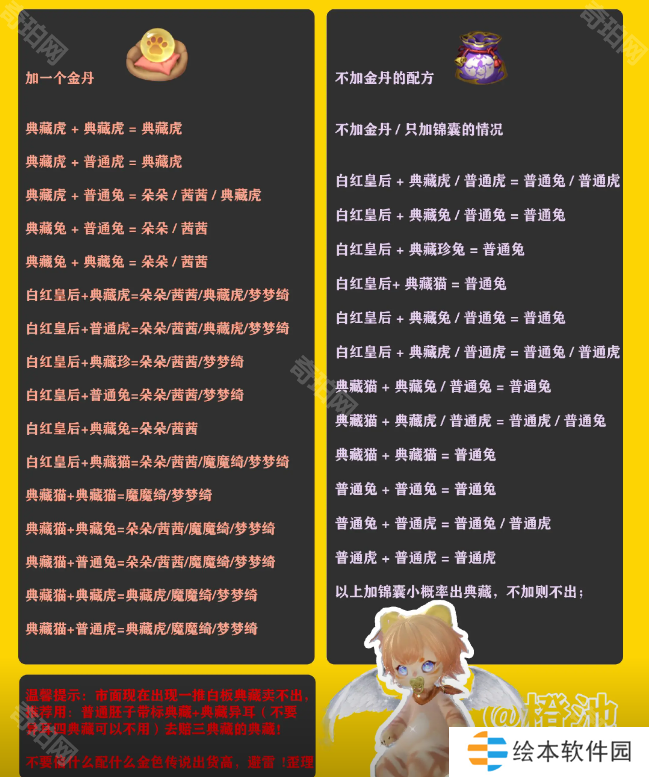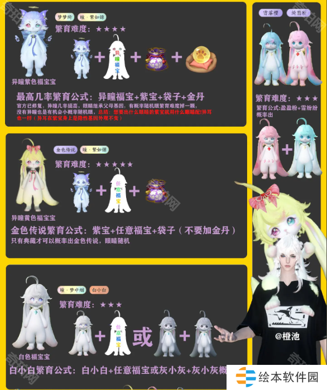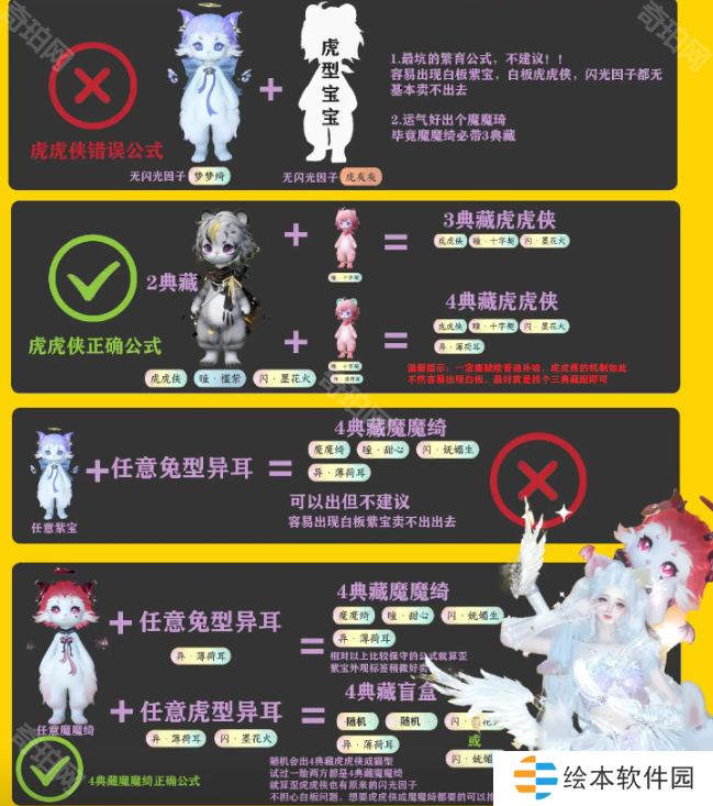 ②魔魔绮:不要用【梦梦绮】+【兔形福宝宝】去赌变异,容易出白板的紫宝。正确方法是用【魔魔绮(自带3典藏)】+【任意带有异耳的福宝宝】去繁育,高概率出4典藏魔魔绮或者其他典藏福宝宝。